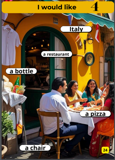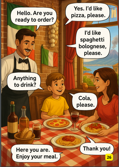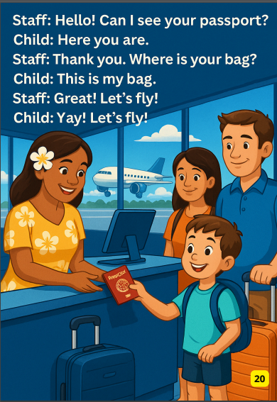 Następnie dzieci poznają krótki, praktyczny dialog sytuacyjny, np. w sklepie, na lotnisku czy w restauracji. Dialog jest prosty, ale osadzony w autentycznej scenerii i zawsze kończy się wymianą grzecznościową.